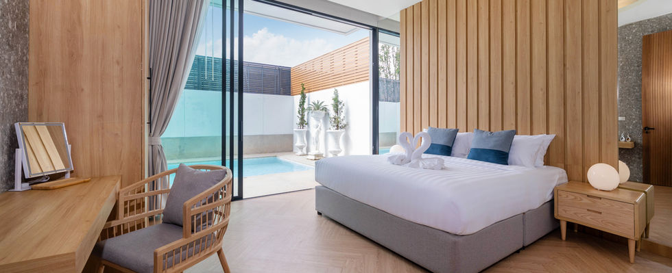 Each villa has 4 bedrooms, an open-plan living and dining area, a fully equipped kitchen, and a master bedroom on the ground level. The living and master bedroom have floor-to-ceiling doors that lead to a pool terrace where you can access the swimming pool and enjoy outdoor activities.